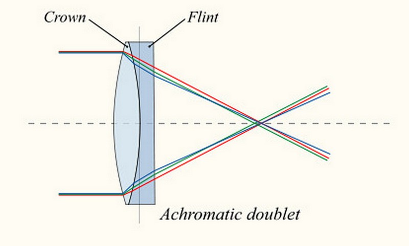 18世紀(jì),光學(xué)家John Dollond發(fā)明了消色差鏡組,將紅藍(lán)兩色聚焦到跟綠色焦面相近的焦面,從而大大減少了軸向色差,提升了清晰度,而且他的設(shè)計(jì)成本夠低,因此消色差物鏡自此逐漸成為了望遠(yuǎn)鏡和顯微鏡的基本配置,直至今天。普通消色差設(shè)計(jì),可以校正紅藍(lán)兩色色差,以及綠色波段的球差。