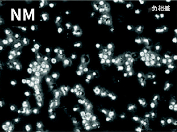 相襯觀察還有正負和對比度高低之分,常見的相襯是正相襯,背景是亮色的,樣品被高亮光環包圍。而負相襯背景呈暗色,類似暗場,樣品主體會呈高亮。負相差物鏡有高對比(NH)和中對比度(NM)區別,會標記在物鏡上。