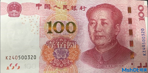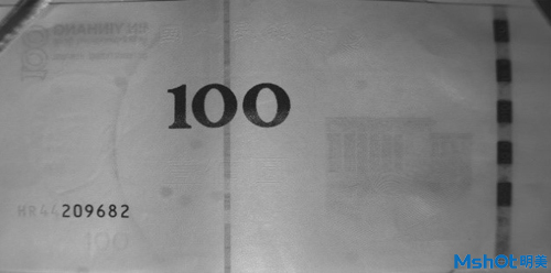 在近紅外光源照射下,使用明美近紅外相機拍攝100元人民幣進行防偽鑒定:可見光與單色光下紙幣無變化,近紅外相機拍攝下紙幣(真幣)背面人民大會堂圖案半邊消失,真幣正面圖案亦可觀察到與可見光譜下明暗不同的圖文。