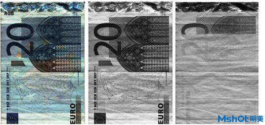 在近紅外光源照射下:20歐元紙幣在可見光和單色光下圖像無差異,而近紅外近紅外相機拍攝下紙幣部分消失,防偽功能突出。