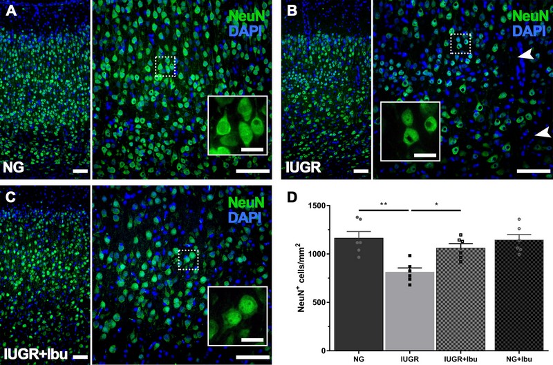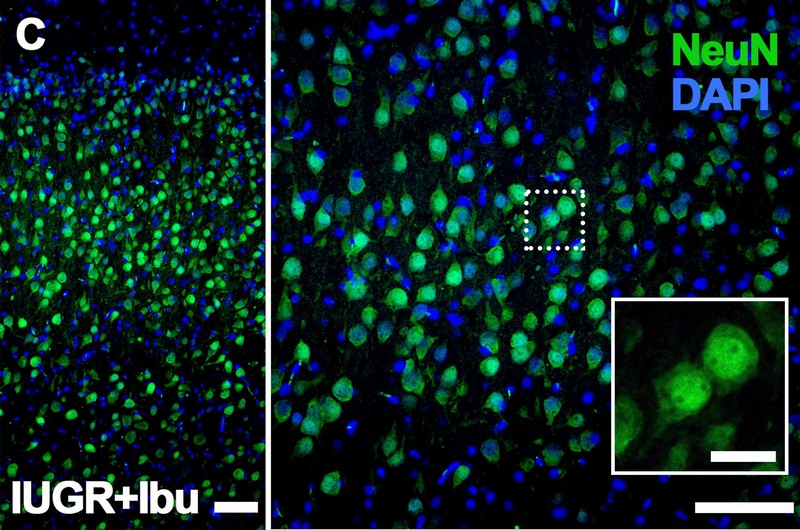 研究人員利用NeuN綠色熒光標記神經元細胞,可以評估神經元的發育情況。對比可以看到,未服藥的IUGR仔豬的神經元發育明顯出現了問題,密度遠遠低于正常發育,服用布洛芬的IUGR仔豬雖然神經元密度還是不如正常發育,但相對已經有明顯改善。