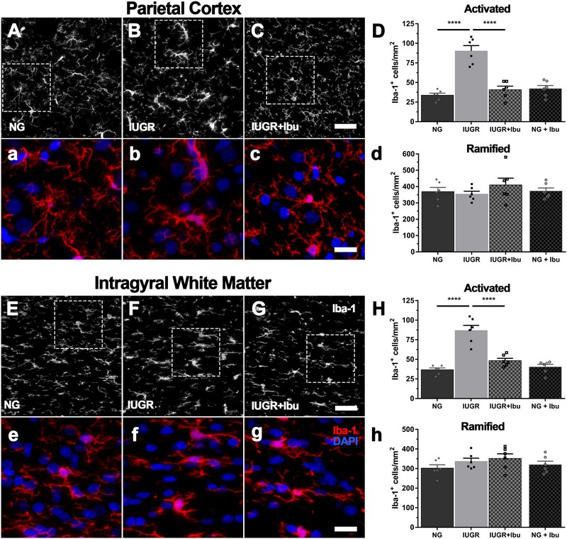 研究人員利用紅色熒光標記膠質細胞,這是大腦的免疫細胞,當出現炎癥反應時,膠質細胞會活性化,變得更加粗壯,占用資源影響其他細胞的生長發育。對比可以看到,服用布洛芬的IUGR仔豬,相對未服用的IUGR仔豬在皮層和白質的炎癥反應都明顯降低,接近正常生長組仔豬。