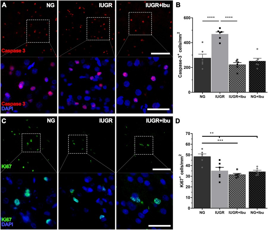 最后,研究人員利用Caspase3紅色熒光跟蹤細胞凋亡,利用Ki67綠色熒光跟蹤細胞增殖,可以看到布洛芬對減少細胞凋亡有明顯作用,但不能提升細胞增殖情況,這意味著它只能早期使用,降低IUGR對幼兒的傷害,但不能一下解決其他各種問題。