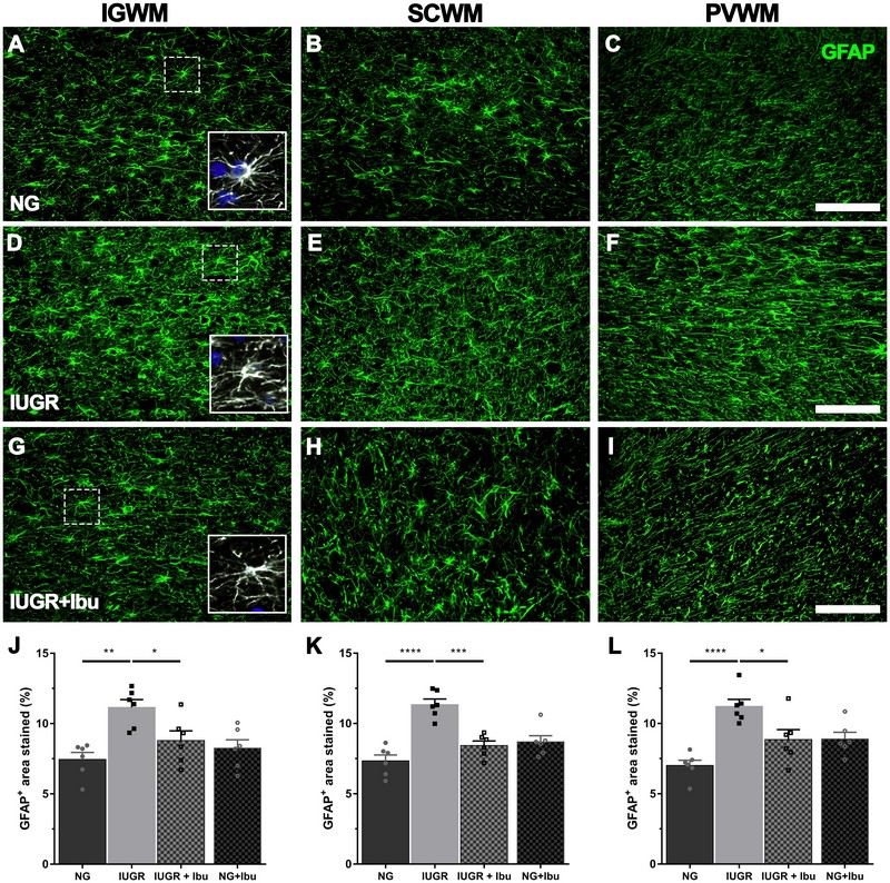 研究人員利用GFAP綠色熒光標記星形膠質細胞,可以評估大腦各部分白質的炎癥反應。對比可以看到,服用布洛芬的IUGR仔豬白質熒光密度遠低于未服用組,接近正常組,說明布洛芬有效降低了整個大腦各區白質的炎癥反應,減少了損傷。