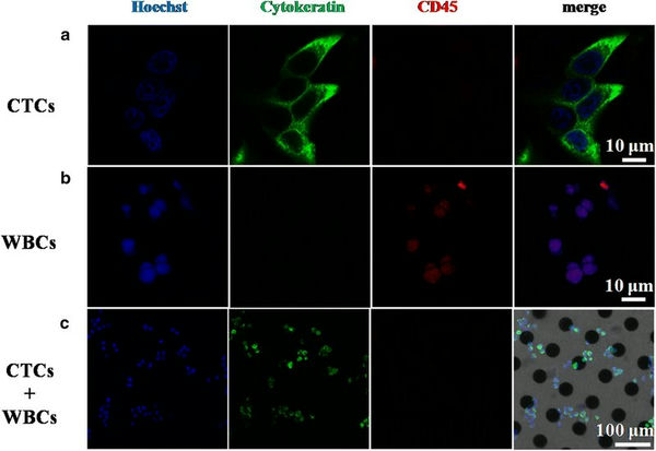 有DAPI熒光(藍)和CK熒光(綠),無CD45熒光且細胞核尺寸較大,判定為CTC;有DAPI熒光(藍)和CD45熒光(紅),判定為白細胞。