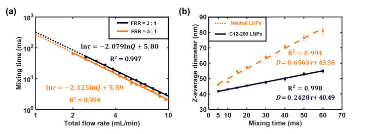 圖1 使用慣性混合器表征混合特性和微調脂質納米粒子的大小。(a) 不同流速比下混合時間與總流速的函數關系。實線表示完全混合,虛線表示不完全混合。在本實驗中,混合器的通道尺寸為 250 μm,混合時間是通過明美倒置顯微鏡拍攝后進行計算。(b) 不同混合時間下 C12-200 LNPs 和中性 LNPs 的平均粒徑,使用 250 μm 的混合器,FRR 為 5:1結果為三個獨立批次的平均值 ± SD。