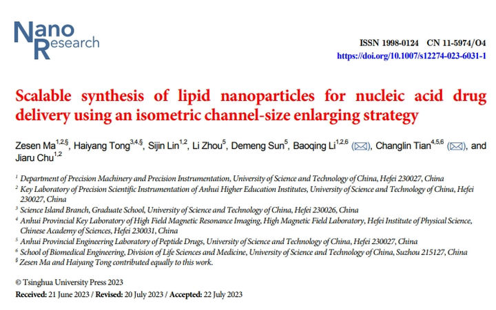 為此,中科大工程學院褚家如教授團隊的李保慶副教授與生命科學與醫學部田長麟教授團隊經過深入研究,提出了一種“等比例縮放通道尺寸”的可擴展化脂質納米粒子合成策略。該策略通過在三個維度上等比例縮放慣性微流體混合器,實現了LNPs的可擴展合成。同時,我們基于流體力學的相似性理論并利用無量綱分析開發了一種理論預測方法,通過控制混合時間在不同芯片上保持一致,確保合成的LNPs具有一致的粒徑和尺寸分布。這一創新性方法為LNPs的大規模生產提供了實際可行的途徑,加速了核酸藥物研發向臨床應用的轉化。相關成果發表在Nano Research上。中國科學技術大學博士生馬澤森和童海洋為該論文共同主作者。
