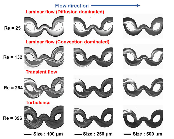 圖3通道尺寸為100、250和500μm的混合器的前兩個混合元件的流態俯視圖。流動狀態包括層流(Re=25和132)、瞬態流(Re=264)和湍流(Re=396)。圖像經過數字處理以增強對比度。將溶解有黑色染料(0.025g/mL)作為示蹤劑的去離子水和乙醇以3:1的FRR泵入混合器中。流動方向是從左到右。