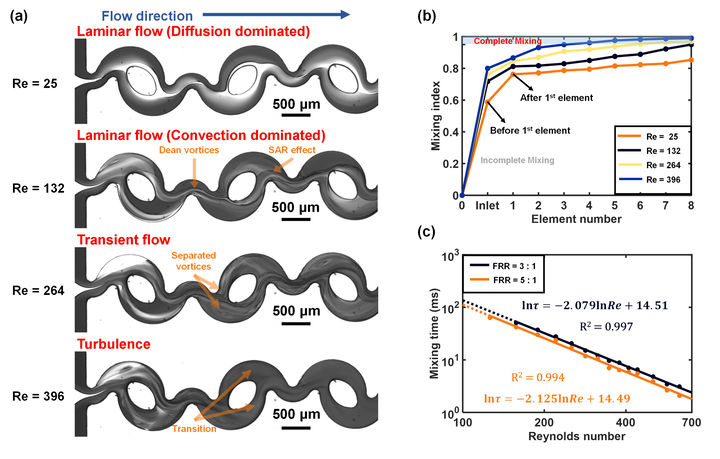 圖2 慣性流混合器中流動狀態和混合特性的演變。(a) 前三個混合元件中流體在層流(Re= 25和 132)和湍流(Re= 396)時的流動俯視圖,使用明美倒置顯微鏡拍攝。(b) 不同流動距離下混合物流的混合指數。不同流動距離下的混合指數,FRR 為 5:1。混合指數用于評估混合過程,0.95 的值被設定為可接受的完全混合下限。(c) 不同流速比下混合時間與雷諾數的函數關系。實線表示完全混合,虛線表示不完全混合。所用混合器的通道尺寸為 250 微米。