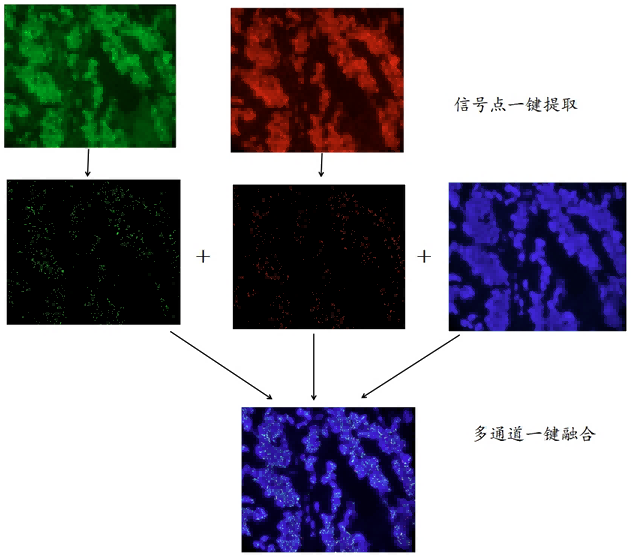 熒光顯微鏡檢做為FISH檢測(cè)最后一道關(guān)鍵工序,在推進(jìn)FISH技術(shù)的進(jìn)程中扮演著不可或缺的角色。Mshot明美開發(fā)了FISH熒光鏡檢的整套解決方案,這其中包括Mshot明美科研級(jí)正置熒光顯微鏡MF43-N以及專用于FISH檢測(cè)的醫(yī)學(xué)影像處理軟件系統(tǒng)Mshot V2.0,醫(yī)學(xué)影像處理軟件系統(tǒng)配套了2100萬(wàn)像素科研級(jí)制冷高分辨率、高靈敏度、高特異性的熒光攝像頭,軟件具有自動(dòng)熒光信號(hào)點(diǎn)提取、景深擴(kuò)展、多通道融合及自由報(bào)表等功能,打通FISH樣片熒光檢測(cè)—圖像處理—出具報(bào)告這條完整產(chǎn)線的應(yīng)用需求。其中強(qiáng)大的自動(dòng)熒光信號(hào)點(diǎn)提取功,可以將提取出的信號(hào)點(diǎn)不丟失、亮度不減弱,快速且準(zhǔn)確,大大提升了FISH圖像處理效果以及FISH圖像處理效率。以下是FISH熒光信號(hào)點(diǎn)一鍵提取功能的效果演示。