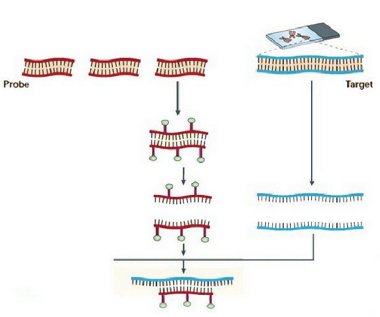 利用DNA堿基對(duì)的互補(bǔ)性,將直接標(biāo)記了熒光的單鏈DNA(探針)和與其互補(bǔ)的目標(biāo)樣本的DNA(玻片上的標(biāo)本)雜交,通過觀察熒光信號(hào)在染色體上的位置反映相應(yīng)染色體的情況。