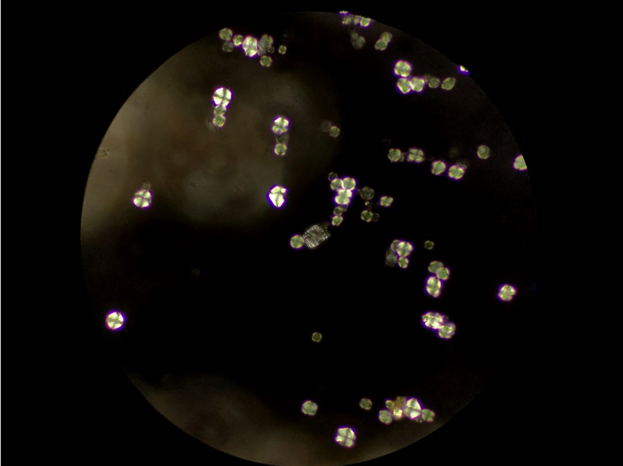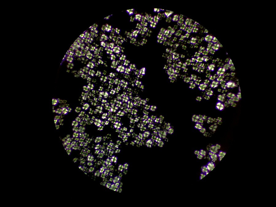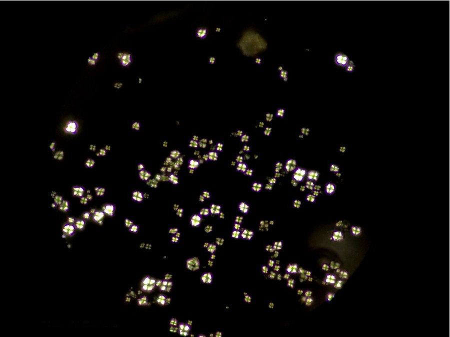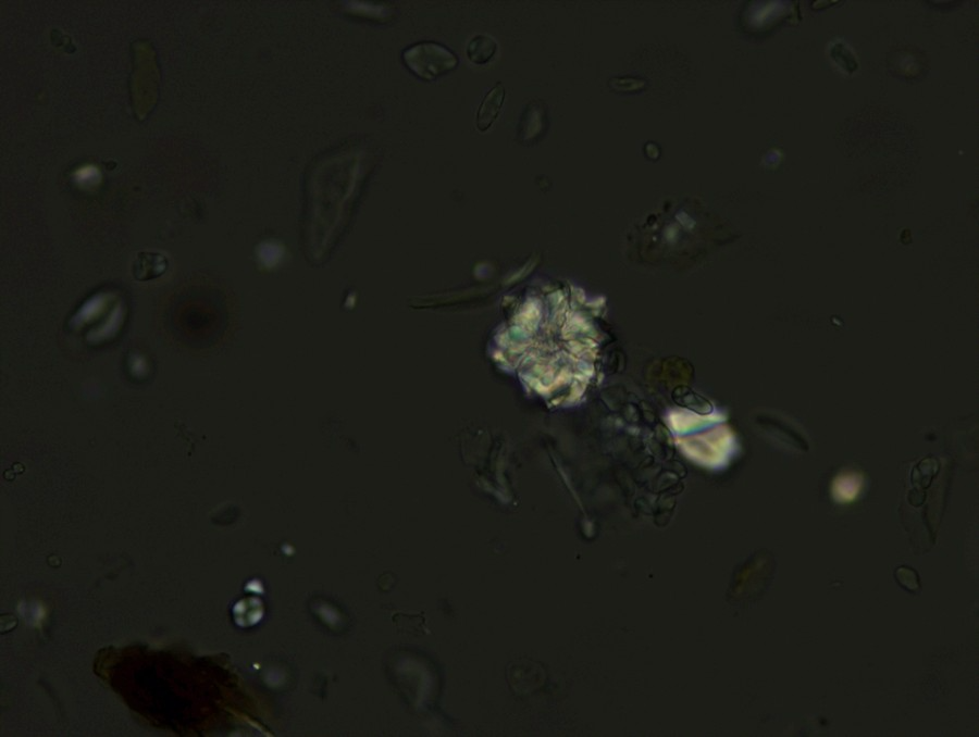 在其他視野中,我們也看到了一些其他偏光反應,可能是草酸鈣簇晶之類成分,也可能是玻片或者水中的雜質。