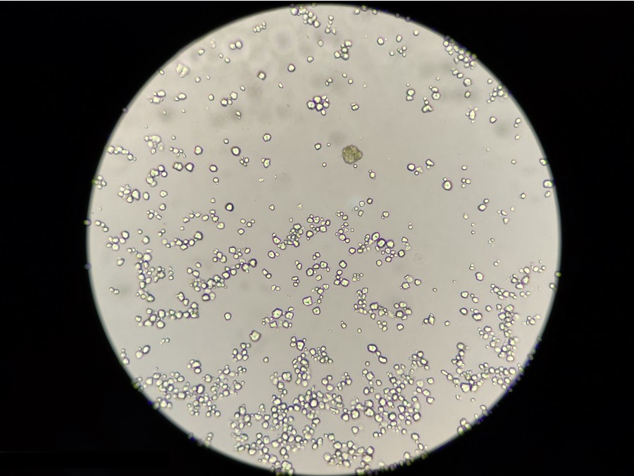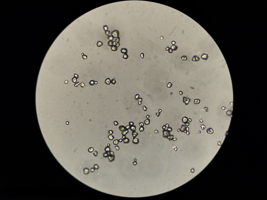 偏光觀察是對結晶物質的形態進行觀察和測量的一種技術,在生物顯微鏡ML31基礎上加入偏光附件,即可升級為簡易偏光顯微鏡ML31-P,正交偏光下可以看到顆粒出現了偏光反應,形成以粒心為中心的黑色“十”字外觀,這是淀粉粒的典型特征。
