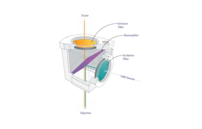 激發塊(cube)里面包含激發濾光片(EX)、二向分光鏡(DM)和發射濾光片(EM)。激發濾光片用于把光譜光源收窄成激發光波段,避免其他波段的光線進入激發塊形成干擾;二向分光鏡既能反射激發光到樣品上,又能讓樣品發射光通過,到達發射濾光片;發射濾光片會把發射光以外的激發光、雜散光都過濾掉,從而讓用戶更清晰地觀察目標熒光標記。